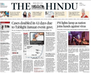By its standards, The Hindu has a bold lead headline: ‘Cases doubled in 4.1 days due to Tablighi Jamaat event: govt’. The report states the meeting “pushed up the doubling rate to 4.3 days from the estimated 7.4 days..’’ Also, according to the Centre, there is “no evidence to suggest airborne transmission…’’