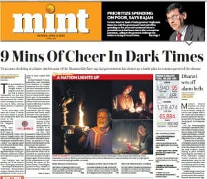 In “9 Mins Of Cheer In Dark Times”, Mint expands on the “dark times” and contrasts it with a photograph of the PM lighting a lamp. “Public health experts have said that the situation may spin out of control, if social distancing measures being put in place by the government are not adopted strictly,” it reports.