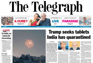 The Kolkata daily still manages to be witty with its headlines in dire times — `Trump seeks tablets India has quarantined’. The report says, “Trump’s request during a phone call to Modi was made on the same day India tightened rules banning the export of hydroxychloroquine. The export ban, without exceptions, came after the Union health ministry changed the national treatment guidelines to include a regimen of hydroxychloroquine and azithromycin to treat Covid-19 patients.”
