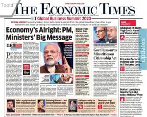 The Economic Times leads with a few “reassuring” messages from the Modi government, first about the economy and then the citizenship law. In its lead the ‘Economy’s Alright…’, PM Modi is quoted as saying that the government’s “policies are clear..fundamentals are strong” and a “$5 trillion economy achievable“.