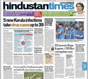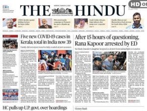 Like TOI, The Hindu also gives Kapoor more play on page 1, over COVID-19. The lead (‘After 15 hours of questioning, Rana Kapoor arrested by ED’) notes, “Despite prolonged questioning, Mr. Kapoor was found to be uncooperative and hence, the need for custodial interrogation was deemed necessary.”