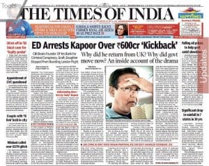 The Times of India indicates the importance of the Yes Bank crisis by giving it a six-column lead spread. In ‘ED arrests Kapoor over Rs 600cr kickback’, the paper notes he was arrested after “30 hours of questioning, capping two days of action that began with raids on the banker’s Samudra Mahal residence in Worli and curbs being imposed on withdrawals from the bank.”