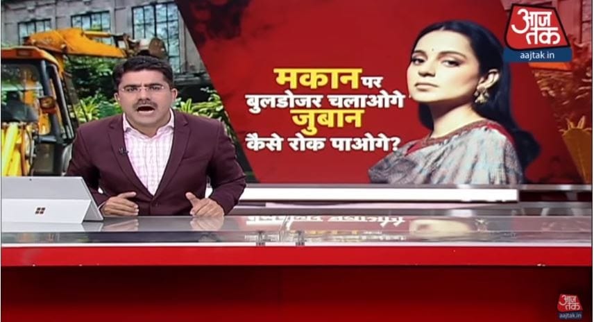 Aaj Tak‘s Rohit Sardana chose a rather more dramatic route when he declaimed, “Makaan par bulldozer, zabaan kaise rokoge?” (You can bulldoze the building but how will you drown out the voice?)