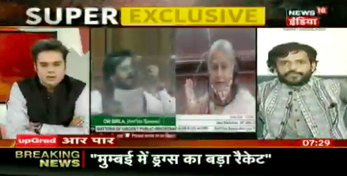 News 18 India’s Amish Devgan opted to avoid China and talk about the, er, pressing issue of Bollywood. He was visibly excited about his guest Ravi Kishan, the Bhojpuri actor and MP whose comments on drug addiction in the film industry angered Jaya Bachchan so much that she made an impassioned speech in the industry’s defence in Parliament.