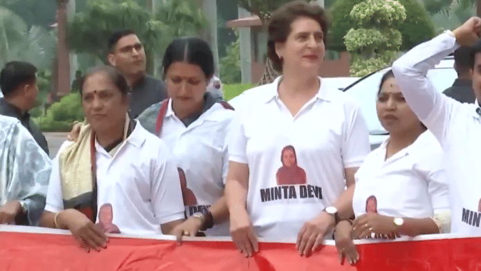 On Tuesday, several Opposition MPs, including Congress MP Priyanka Gandhi, wore T-shirts with Minta Devi’s name and face printed on the front, and “124 Not Out” written on the back.