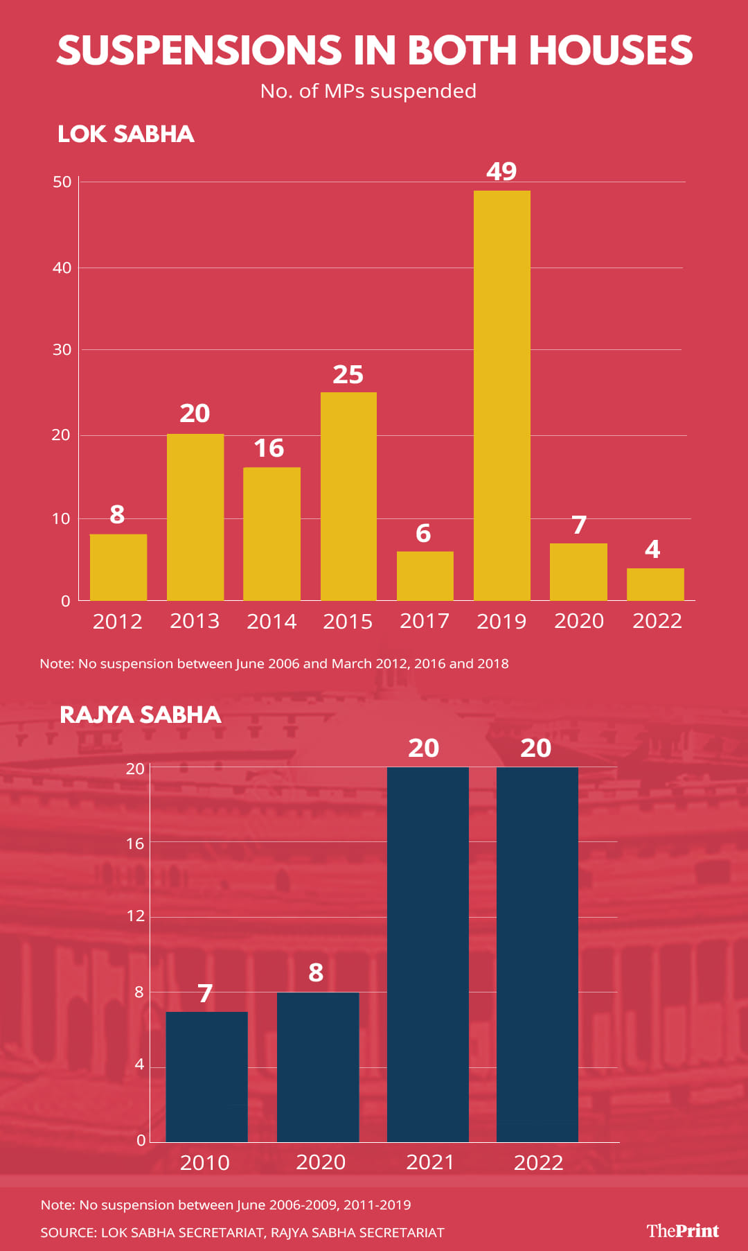 Data gathered by ThePrint from the Rajya Sabha and Lok Sabha secretariats and their respective websites for the eight years preceding the NDA government — 2006 to 2014 — and the eight years of the BJP-led NDA government from 2014 till now, shows that suspending MPs has become more of a norm than an exception.