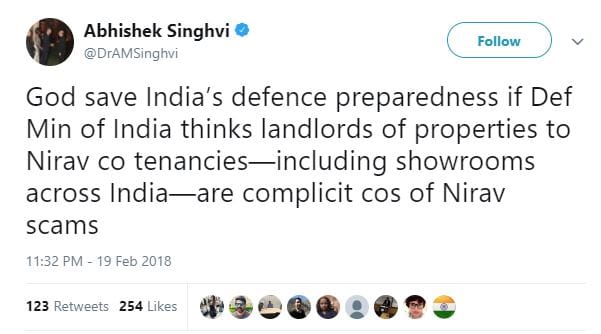 BJP claimed Nirav Modi was a tenant in commercial property owned by Abhishek Singhvi’s family company; the Congress spokesperson called it ‘cheap politics’.