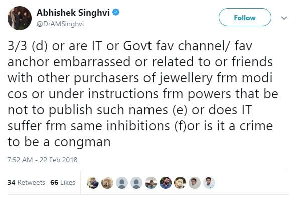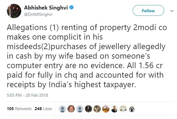 Singhvi denied all such allegations and categorically stated that his wife purchased some jewellery that had been paid for with a cheque. He tweeted that Times Now “conveniently carries selectively leaked doc allegedly recovered frm someone’s PC.”