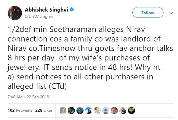 On 17 February, Defence Minsiter Nirmala Sitharaman held a press conference on the Rs 11,400-crore scam in which celebrity jeweller Nirav Modi is the main accused. Apart from saying that the “original sin” — the scam — had begun under the UPA government, she also tried to cast suspicion on Singhvi, who is also a top Supreme Court lawyer.