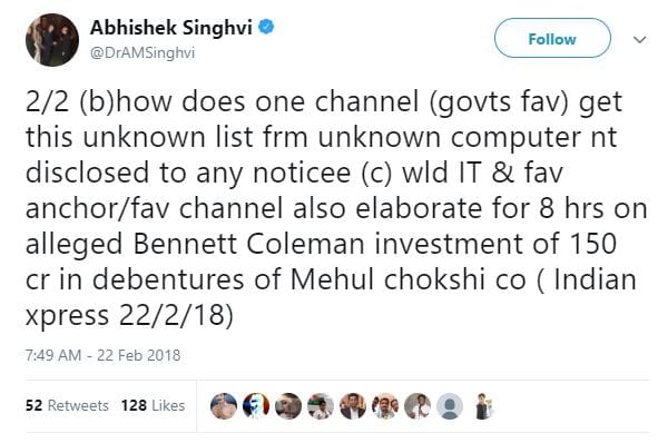 “How does one channel (govts fav) get this unknown list from unknown computer not disclosed to any notice?” Singhvi tweeted. Apart from this news report, there is no other report on Singhvi’s wife’s expenditure. Stating that he’s among the highest taxpayers in his category, Singhvi tweeted that “harassment, innuendo, insinuation must have its limits”.