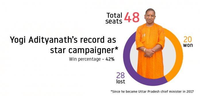 But does the Yogi magic actually work? ThePrint has delved deep into data to examine Yogi’s strike rate in the constituencies he has covered since he became UP CM in 2017. He has visited 48 – 45 in Gujarat and Himachal Pradesh, and three in other states where bypolls were held – UP’s Sikandra, Madhya Pradesh’s Chitrakoot, and Kerala’s Vengara.