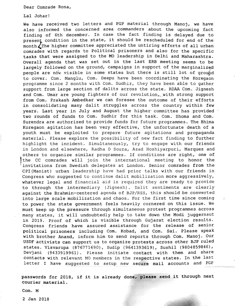 The Congress’ name also comes up in another letter dated 2 January, 2018, written by a ‘Comrade M’ to ‘Comrade Rona’. It says: “Congress friends have assured assistance for the release of senior political prisoners including Com. Kobad and Com. Sai.”