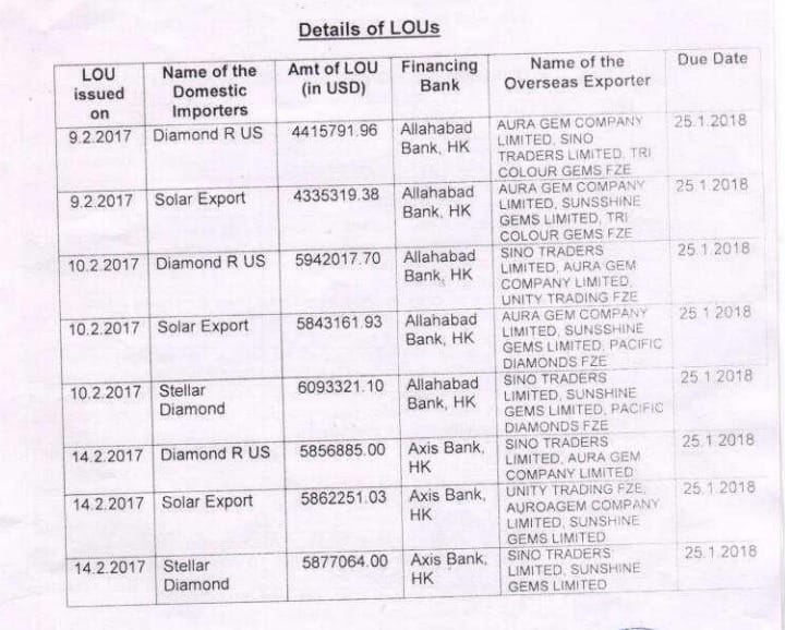 The next day, the accused duo issued three LOUs on behalf of Diamond R US, Solar Exports, and Stellar Diamond for $5,942,017.70, $5,843,161.93 and $6,093,321.10 respectively, due on 25 January 2018, favouring Allahabad Bank, Hong Kong.