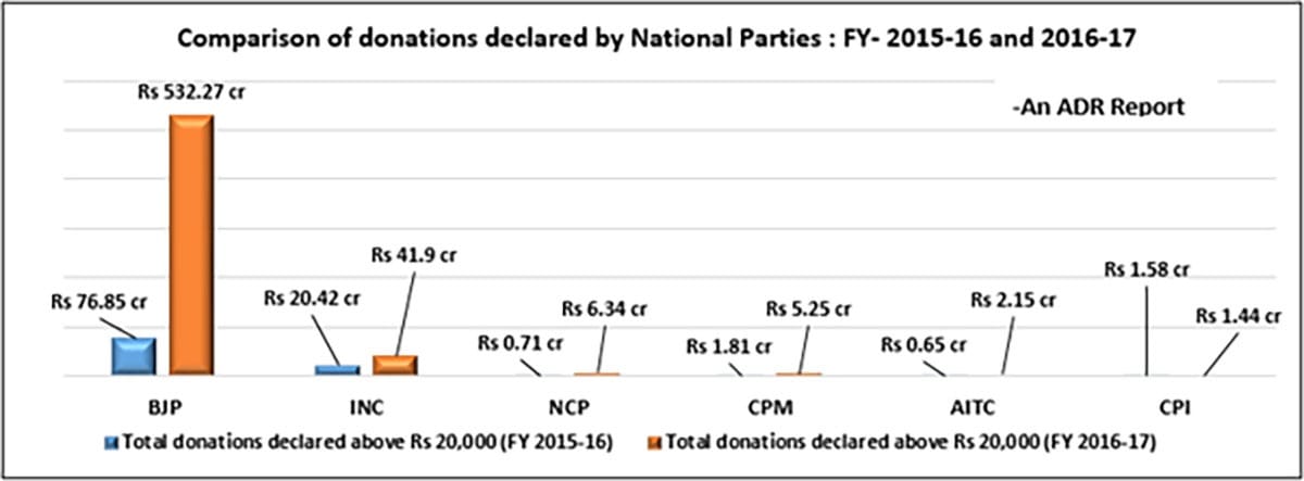 It found that the total declared donations by the seven national parties — the BJP, Congress, BSP, NCP, CPI, CPM and the Trinamool Congress — increased by 478 per cent from Rs 102.02 crore in 2015-16 to Rs 589.38 crore in 2016-17.