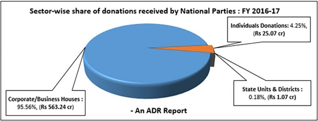 It found that while the declared donations of all the parties was Rs 589.38 crore in 2016-17, the total income in the same period was Rs 1559.17 crore — of which 45.59 per cent came from unknown sources.