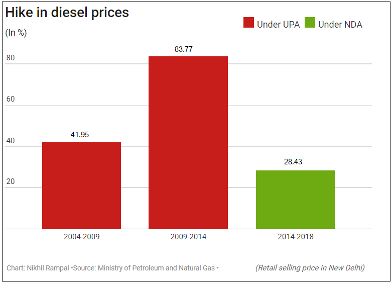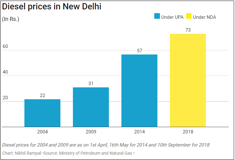 The retail selling price of diesel rose from Rs 21.74 in 2004 to Rs 56.71 in 2014. From 2014 to 2018, the price rose to Rs 72.83.