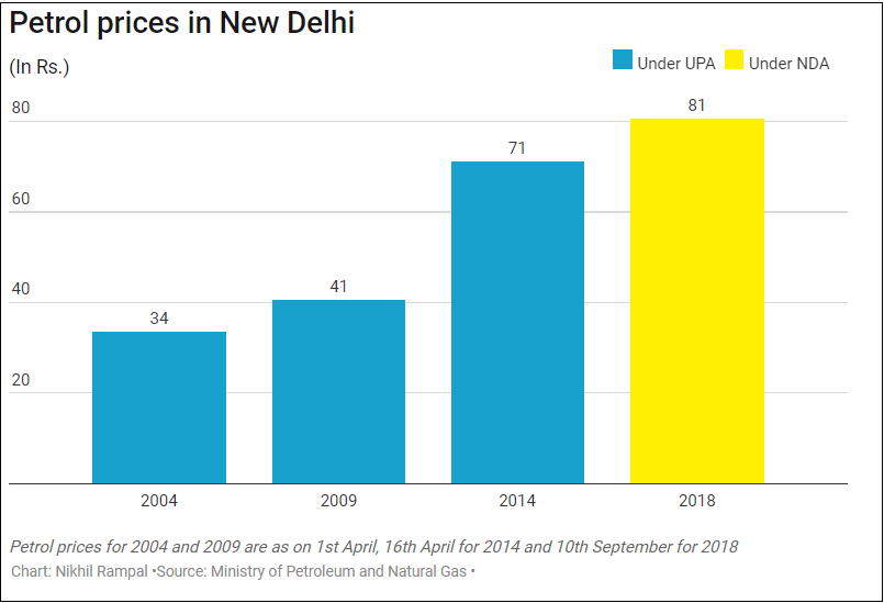 The retail selling price of petrol rose from Rs 33.71 in 2004 to Rs 71.41 in 2014 under the UPA. Under the Modi government, the price rose from Rs 71.41 to Rs 80.73 between 2014 and 2018. (All prices are from New Delhi.)