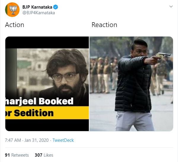 The Karnataka Congress took a swipe at the BJP, saying the earlier tweet indicated the party was taking responsibility for the attack at Jamia Nagar. This resulted in a war of tweets between the two handles.