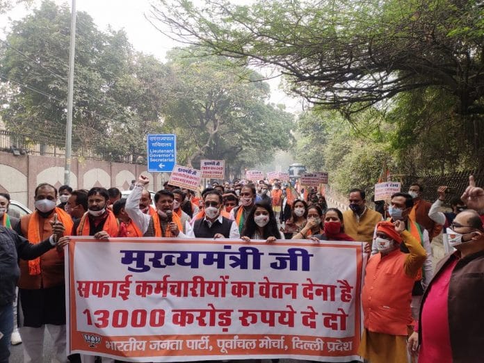 New Delhi: Leaders and workers of the BJP’s Delhi unit and the party’s frontal organisations on Friday staged protests near residences of ministers of the Kejriwal government over the municipal corporation funds issue.