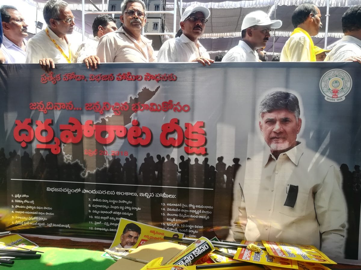 “It is the same place where, in 2013, Narendra Modi had announced he would grant special category status to Andhra Pradesh,” said Nara Lokesh, Naidu’s son and the state minister for information technology and panchayati raj. “Today, our CM is not celebrating his birthday but protesting against the Modi government for the injustice done to the people of Andhra Pradesh.”