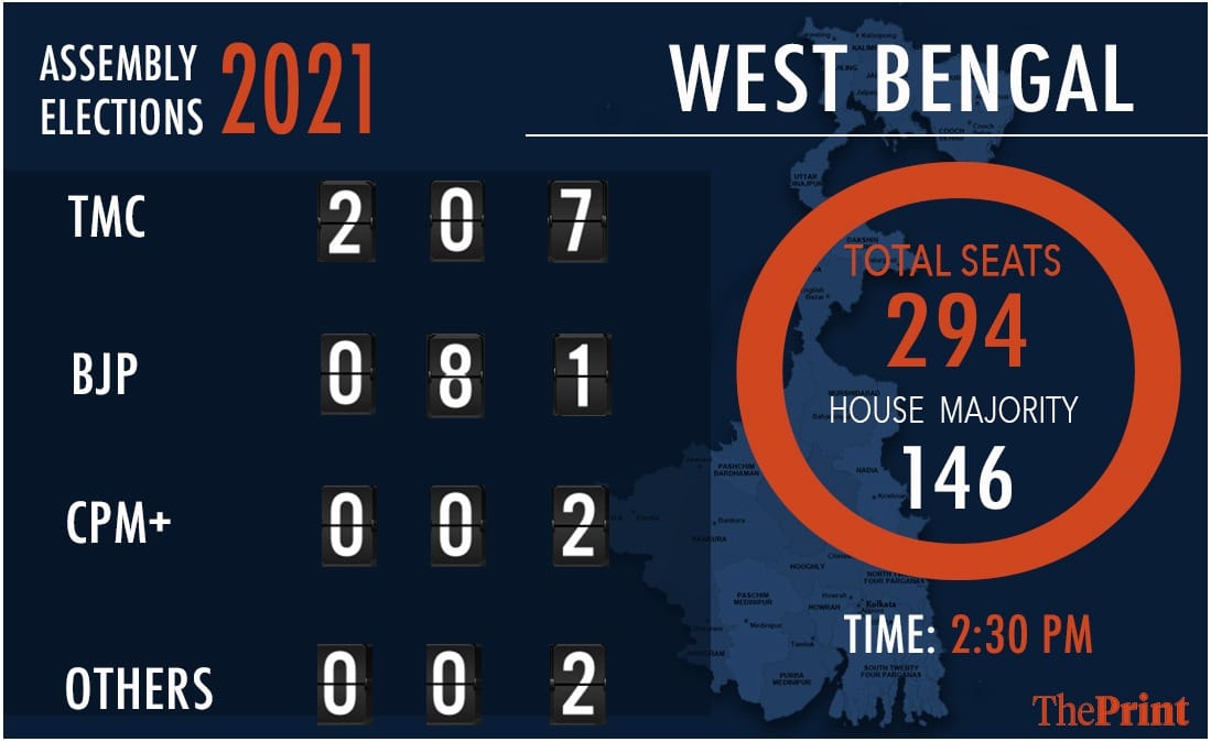 As of 2:30pm, the Trinamool party was leading in 207 constituencies while the BJP was ahead in 81.