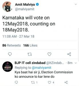 The BJP’s IT cell head, Amit Malviya, and the Congress’ social media in-charge in Karnataka, Srivatsa B., both tweeted the polls would take place on 12 May and counting on 18 May. Incidentally, both got the first date right, and not the second. Both claimed their tweet was based on information flashed by a news channel.