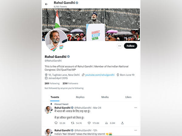 New Delhi [India], March 26 (ANI): Congress leader Rahul Gandhi on Sunday updated his Twitter account bio to ‘Dis’Qualified MP’ after he was disqualified as a Member of Parliament following the Surat court order convicting him in a criminal defamation case over his ‘Modi surname’ remark.