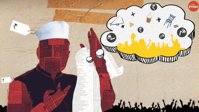 The merchandise to be doled out — like badges, posters, flags, stickers, caps, banners, cut-outs, hoardings, CDs — has been accounted for as well. While a printed T-shirt with sleeves can cost no more than Rs 60, a sleeveless one is capped at Rs 50. A printed muffler should cost Rs 45.