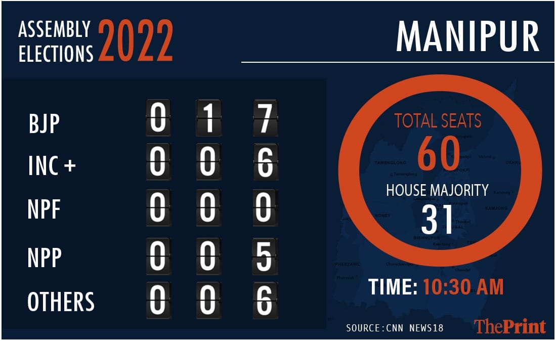 The BJP has crossed the halfway mark in the 60-seat Manipur assembly, where it has been in power for five years in alliance with the NPP, NPF and LJP. It went solo this time and still emerged the single largest party.