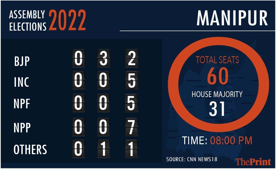 18:15 pm: BJP has crossed the majority mark of 31 in Manipur with 20 wins and leads on 12 seats.