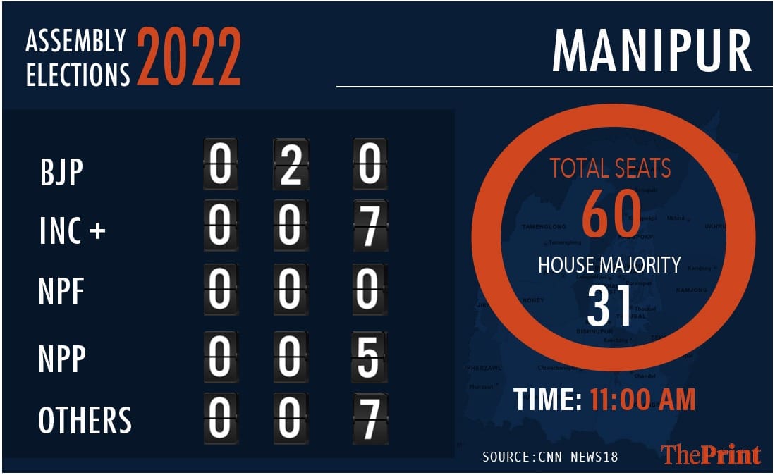 The BJP has crossed the halfway mark in the 60-seat Manipur assembly, where it has been in power for five years in alliance with the NPP, NPF and LJP. It went solo this time and still emerged the single largest party.