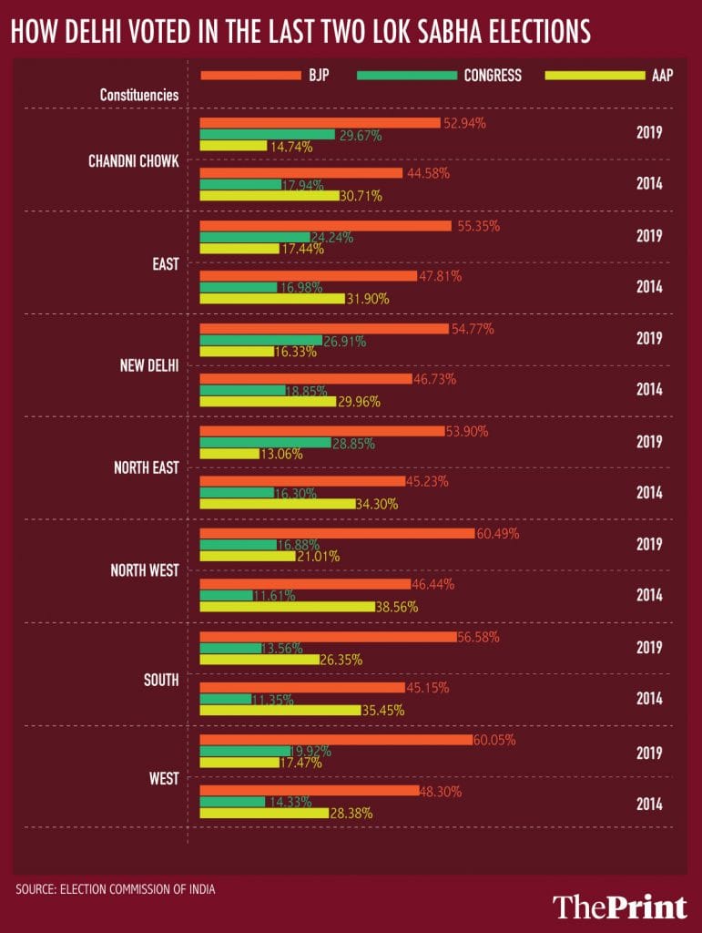 In Chandni Chowk, where the BJP fielded Harsh Vardhan against the Congress’ Jai Prakash Agarwal and the AAP’s Pankaj Gupta, the vote-share of Arvind Kejriwal’s party was down by 15.74 percentage points over 2014. The Congress’ vote-share, on the other hand, went up by 11.73 percentage points and the BJP’s by 8.36 percentage points.