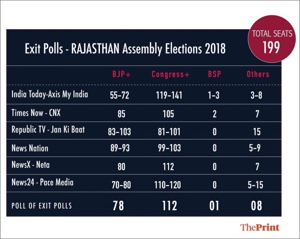 6:15pm: India Today is giving Congress a clear majority with 119-141 seats, and the BJP 55-72 of the 200 seats in Rajasthan.