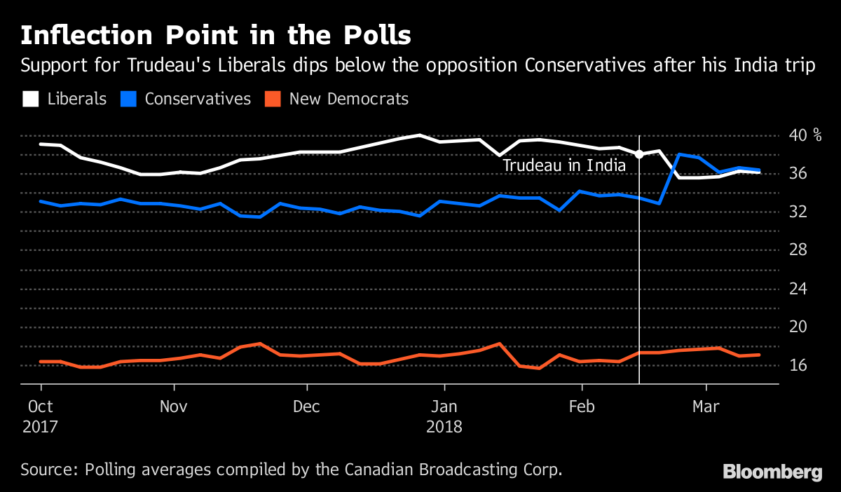 In Canada’s last election, Trudeau was attacked by rivals as “just not ready” to govern, a shot at his inexperience and penchant for selfies and quirky socks. That image was stirred in India and polls show Trudeau’s support is slipping.