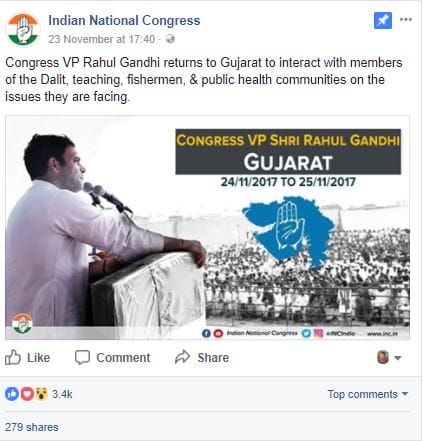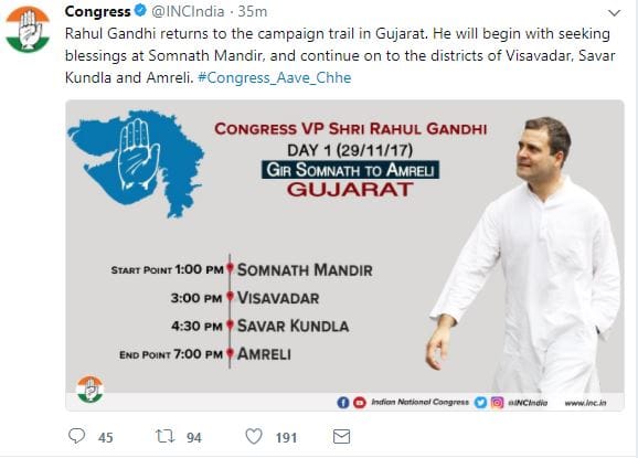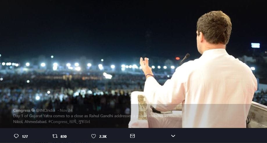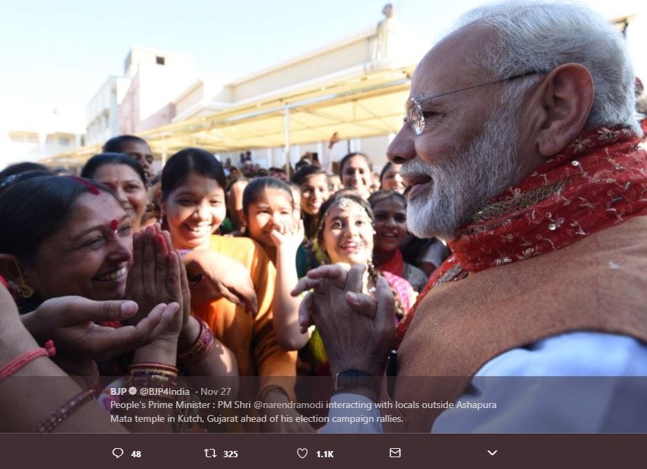 The BJP has subverted the chaiwala meme used by the Congress to its full advantage, painting Modi as a victim of elitist discrimination who needs “his people” to stand with him. #GujaratWithModi is a clever strategy to invoke a sense of loyalty in Gujarat voters by reminding them of BJP’s legacy in the state, as well as simultaneously idolising the Prime Minister. The BJP’s twitter handle is flooded with pictures of Modi holding pro-development rallies in the Gujarat heartland, interacting with members of the community, visiting temples etc.