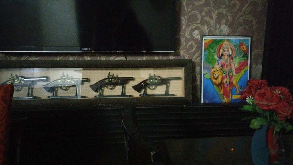 In the living room of his house in Alwar, over 20 residents of the district sit around Ahuja in a semi-circle, each waiting their turn. They stand when called upon, touching Ahuja’s feet before placing their plight before him. In the room next door, a glass case of antique guns shines underneath a rarely used flat screen television. Next to it is a picture of goddess Durga.
