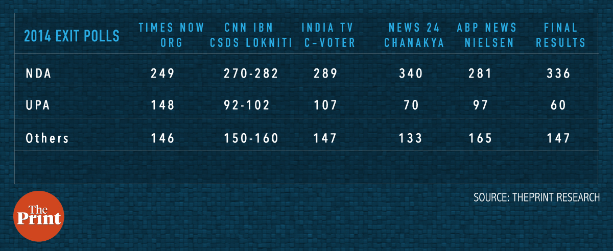 ThePrint analysed select exit polls from the last three general elections — 2004, 2009 and 2014 — in order to find out their accuracy rate. Here are the results: