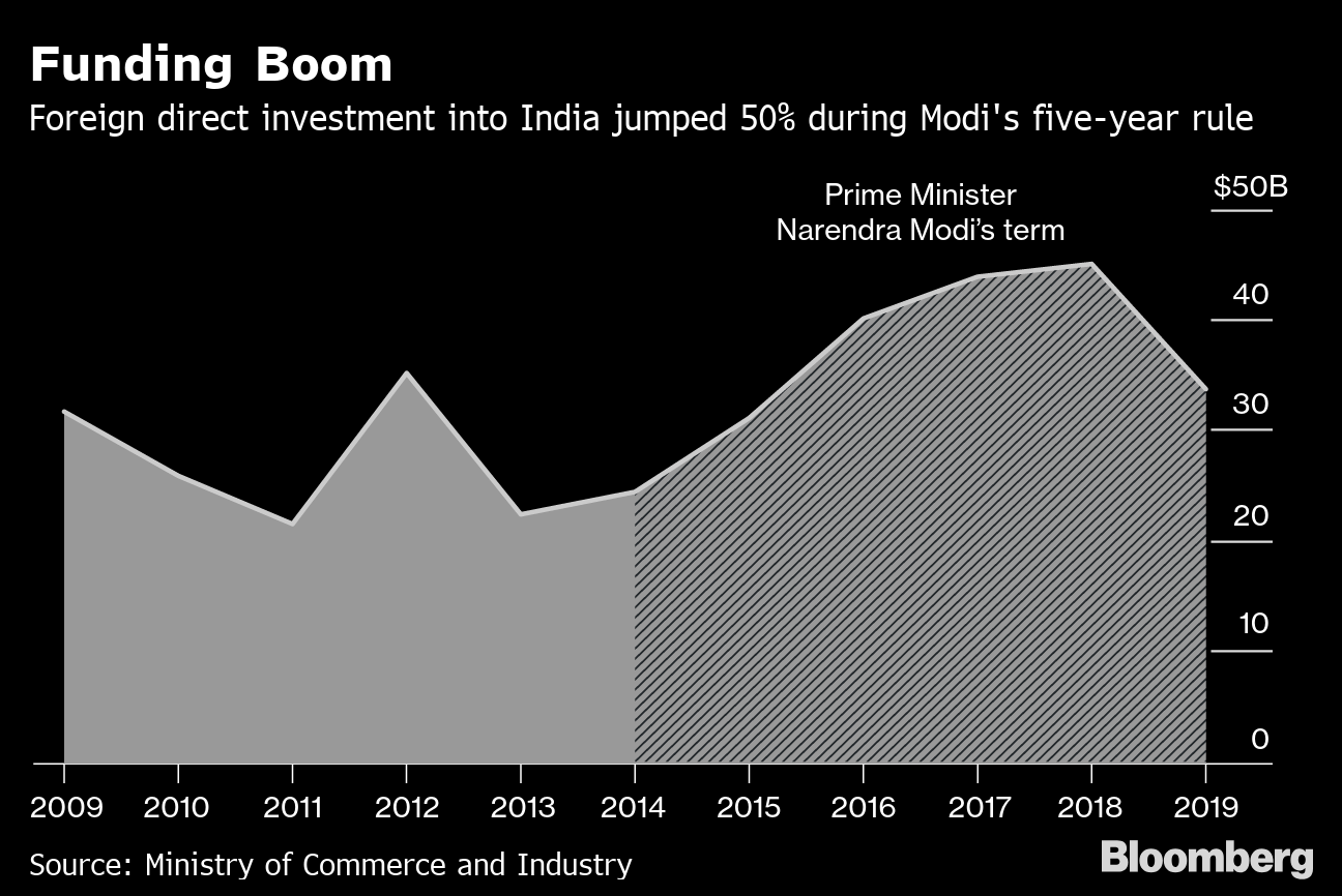 While Modi won investment commitments from longstanding economic and strategic rival China, it largely remains a non-starter. FDI from China totaled $1.5 billion in the four years to March 2018, data from India’s central bank show, against $20 billion President Xi Jinping promised in the five years from 2014.