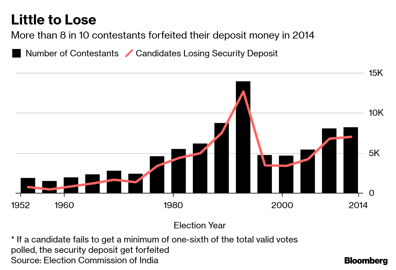 So, why run? Some rebels contest the polls if they’ve been sidelined by their parties, others try to thwart the chances of similarly-named rivals, while still others fight in protest of the political environment. Since 1952, more than three-quarters of aspirants on average have lost their deposits — currently Rs 25,000 ($361) for general candidates and Rs 12,500 for contestants from the underprivileged category.