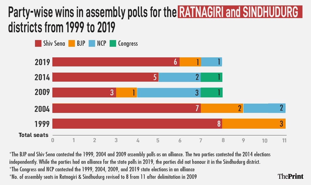 In 2009, following a delimitation exercise, the number of assembly seats in the Ratnagiri and Sindhudurg districts was revised to eight, of which Shiv Sena won three. The party did not win any of the three seats in Sindhudurg (it had contested two). However, its then ally, the BJP, clinched one of the three constituencies in the district.