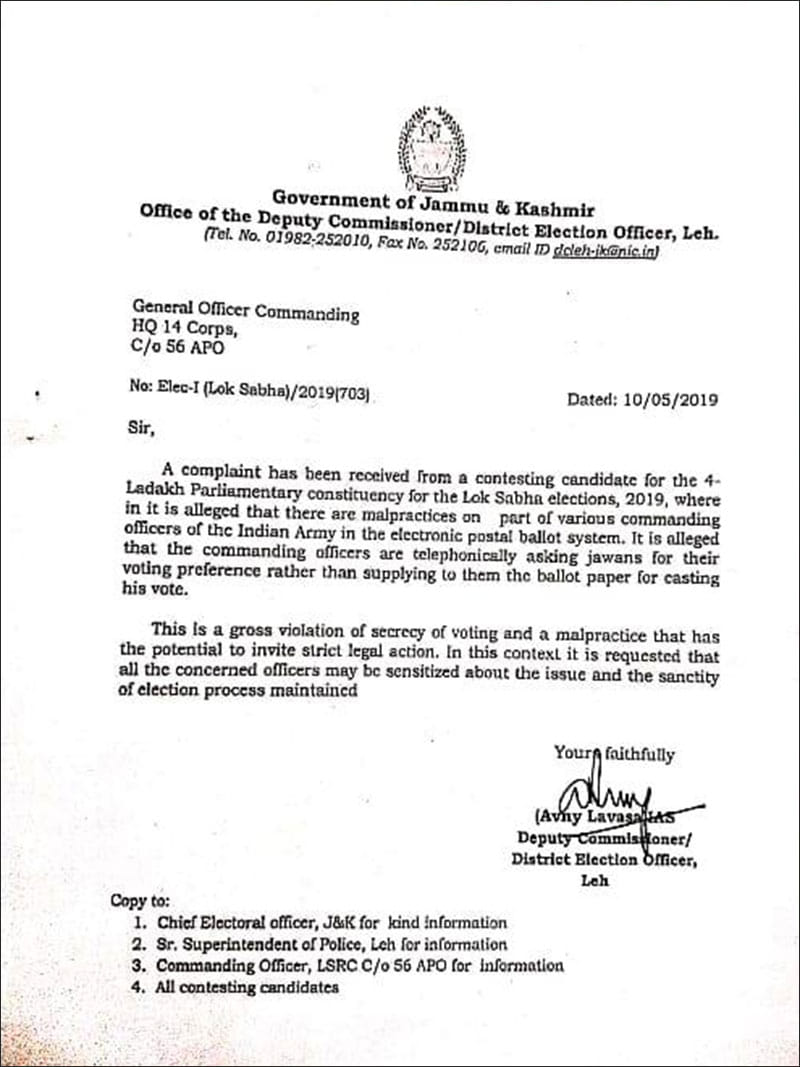 Avny Lavasa, the DC and district election officer for Leh, said a complaint had been received that commanding officers were allegedly indulging in malpractices by asking their jawans about their voting preferences rather than letting them vote directly.