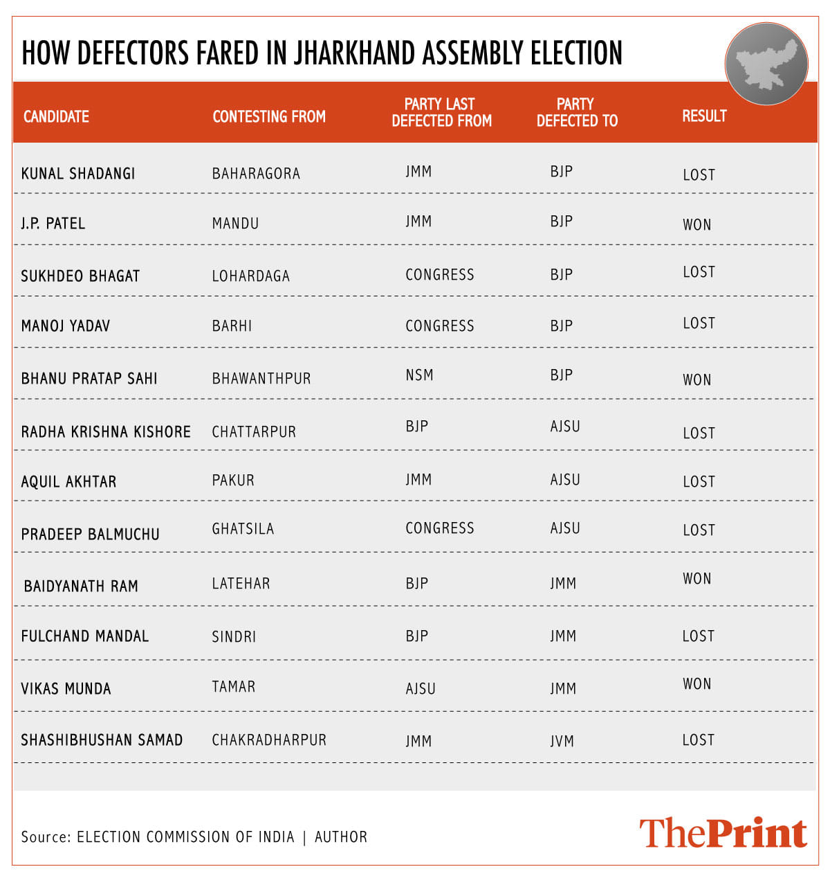 There were, however, a few candidates, who won despite changing sides before the polls. BJP’s Jai Prakash Bhai Patel, who defected from the JMM, won from Mandu by a little more than 2,000 votes.