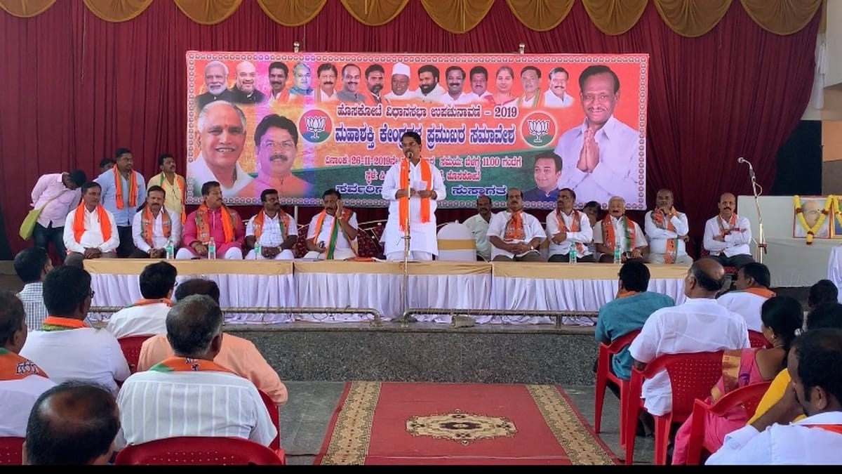 One such meeting was held at the C.S. Convention Hall in Hoskote on 26 November. While senior BJP leaders appealed to those present in the hall to vote for Nagaraju so that the party can provide a stable government for the next three years, the candidate was nowhere in sight.