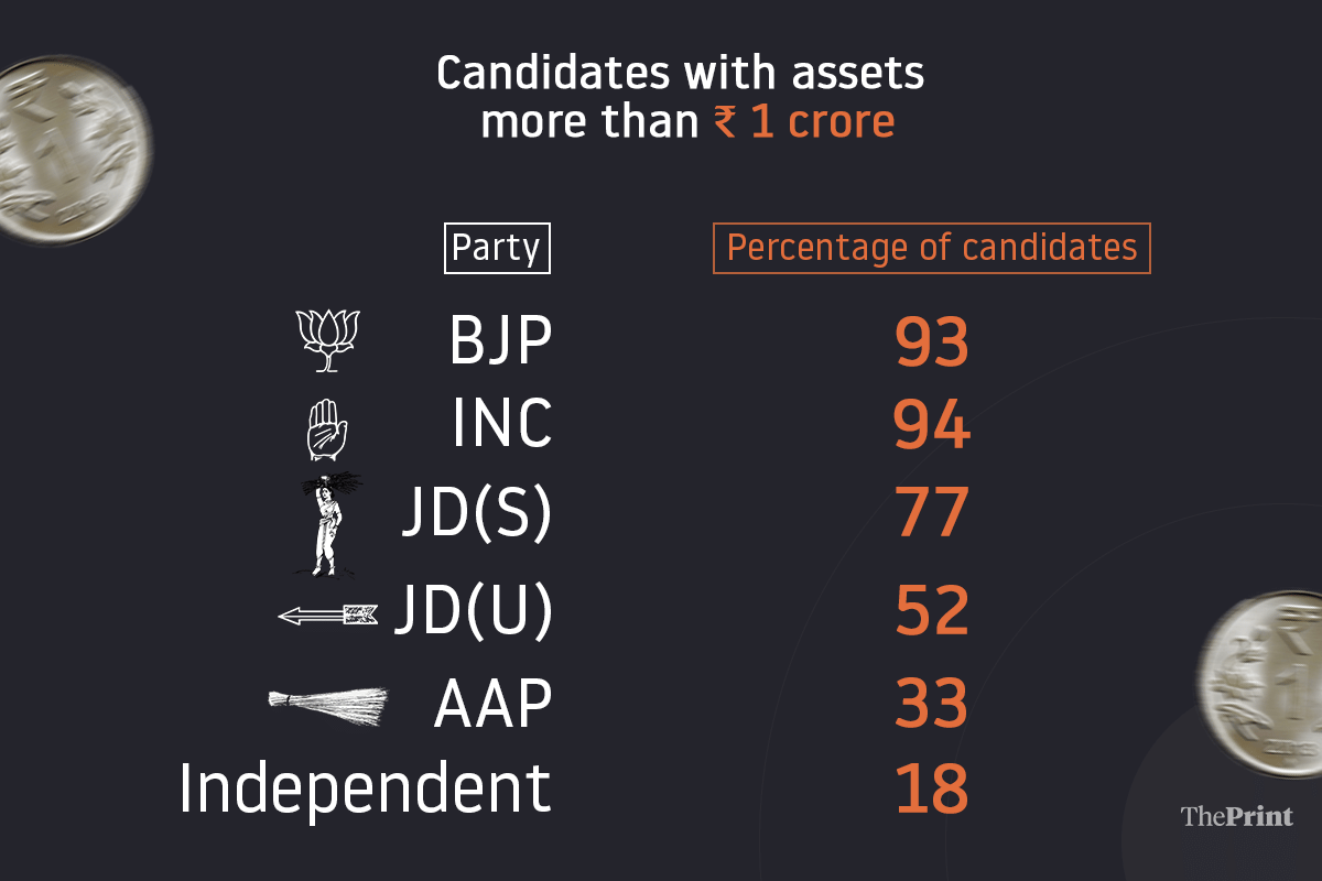The BJP has 208 crorepatis out of 224 candidates (93 per cent). Similarly, 207 out of 220 candidates (94 per cent) in the Congress, 154 out of 199 in the JD(S) (77 per cent), 13 out of 25 (52 per cent) in the JD(U), 9 out of 27 (33 per cent) in the Aam Aadmi Party and 199 out of 1,090 independents (18 per cent) have declared assets worth more than Rs 1 crore.