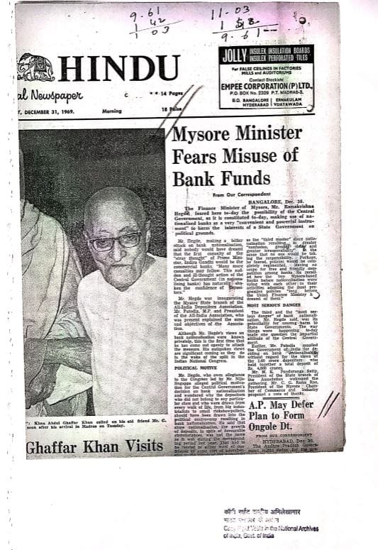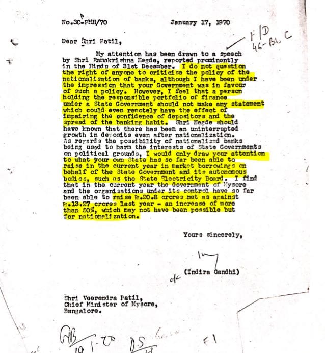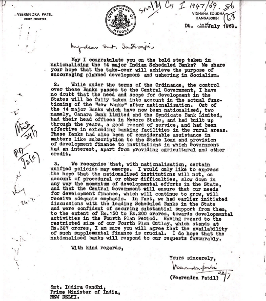 Veerendra Patil, the chief minister of Mysore, wrote to Gandhi supporting her decision to nationalise banks, but in January 1970, the state’s finance minister, Ramakrishna Hegde, made a speech criticising the policy.