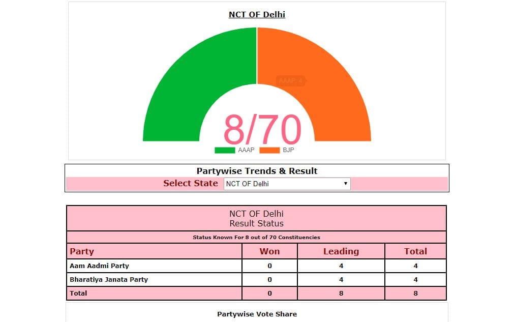 09:26am: Election Commission website declares one seat each for AAP and BJP. However, it has no mention of Congress.