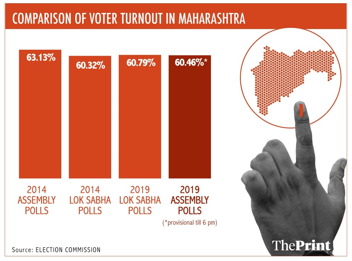 The provisional turnout figures are in line with the voter turnout recorded during the recently-concluded Lok Sabha election, when 60.79 per cent of Maharashtra’s voters turned out to vote. However, the numbers show a dip as compared to the 63.13 per cent turnout during the state assembly election in 2014.