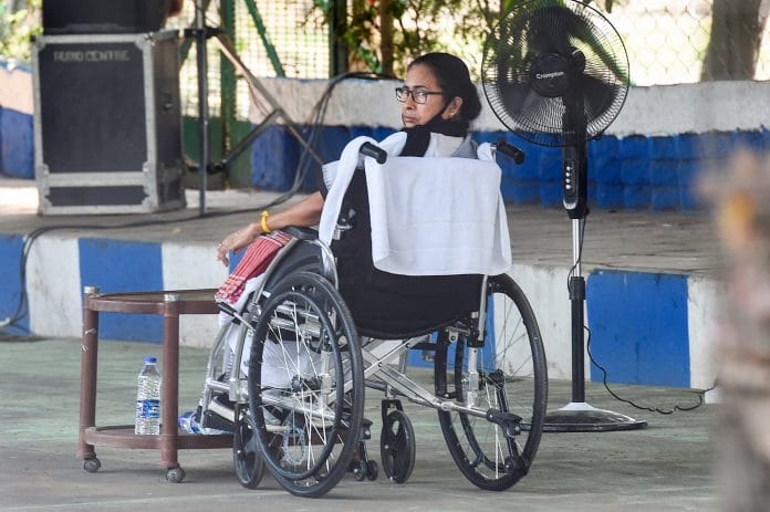 Banerjee, still confined to a wheelchair owing to the injuries she sustained last month, arrived at Mayo road here around 11.40 am and began her sit-in next to a Mahatma Gandhi’s statue at the venue.