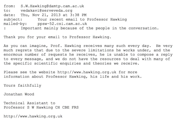 The post referred to a paper published by one Dr Sivarambabu about the Vedas explaining a mishmash of theoretical physics concepts better than modern physics. Furthermore, I could see that I-SERVE tried to validate Hawking’s comments and also ask for his opinion on Sivarambabu’s newer paper titled “The world beyond Fermions (Vedic Model),” by emailing Hawking’s office for comment. They received a response from his technical assistant who simply stated that Hawking doesn’t have the time to answer mails.