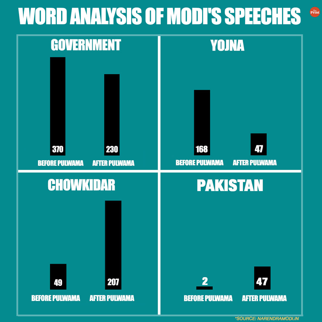 In the 47 public addresses that PM Modi made between 3 January and 3 April, several interesting trends were noticed after the Pulwama attack, a ‘word analysis’ of the speeches by ThePrint showed.
